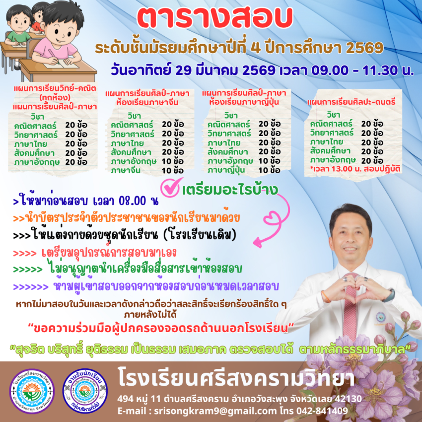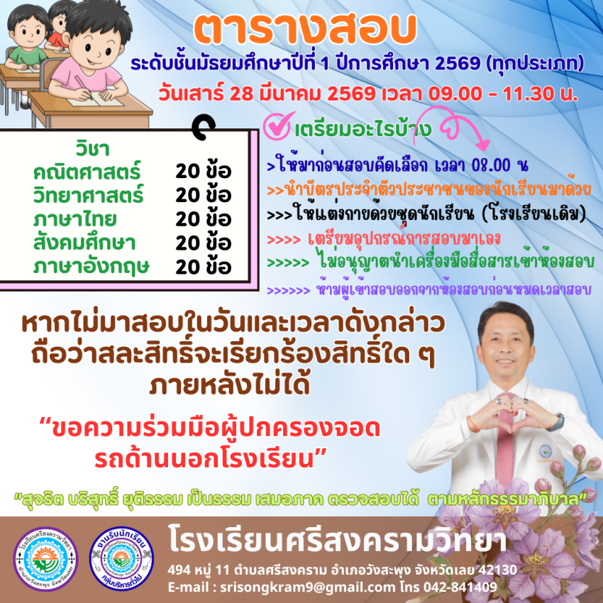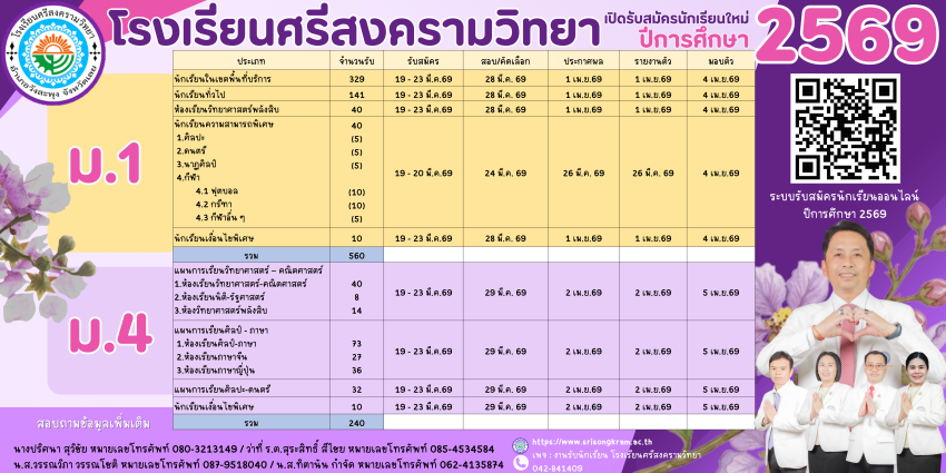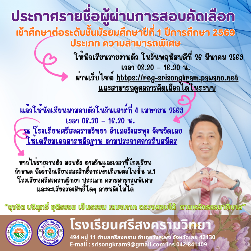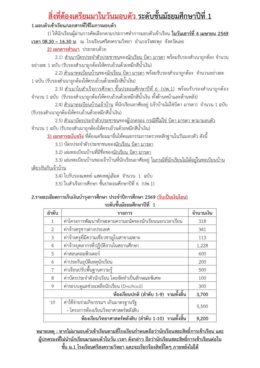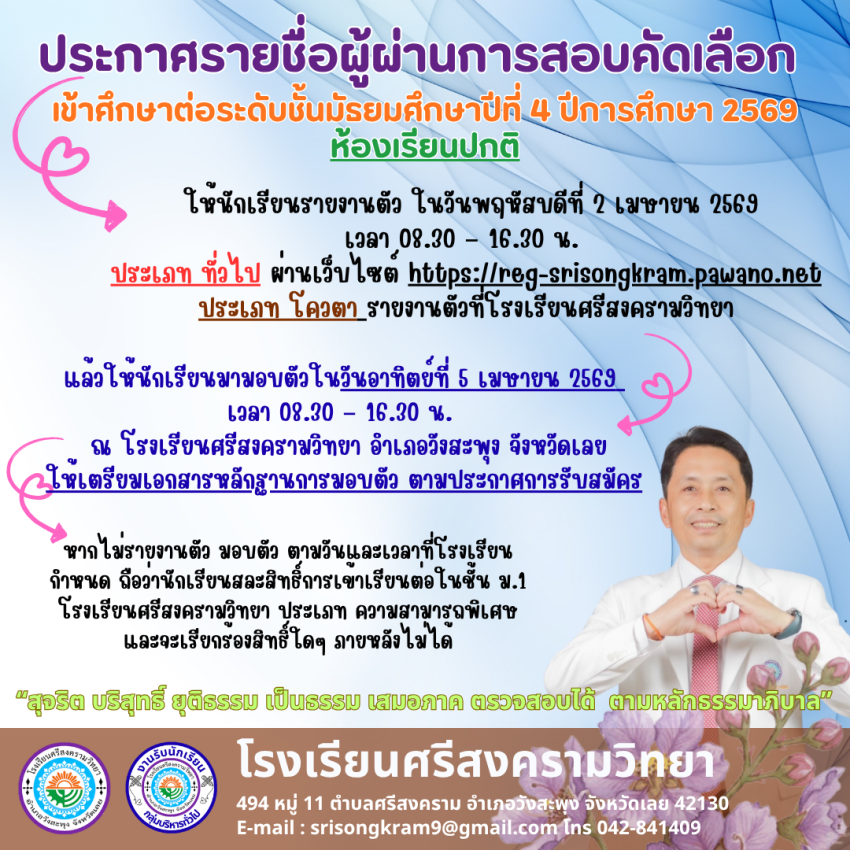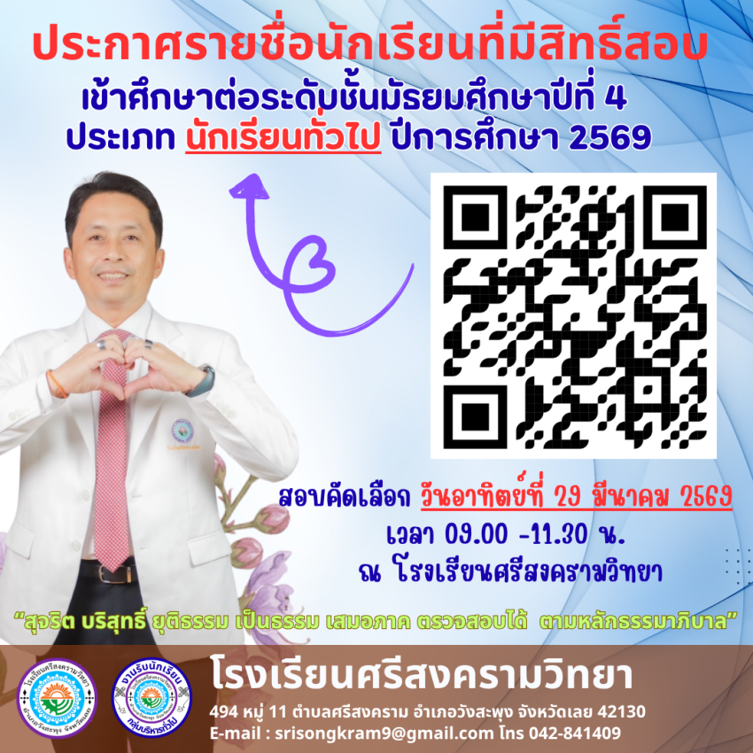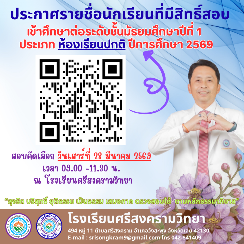 ประกาศโรงเรียนศรีสงครามวิทยาฉบับที่ 64/2569 เรื่อง รายชื่อนักเรียนที่มีสิทธิ์สอบคัดเลือกเข้าศึกษาต่อในระดับชั้นมัธยมศึกษาปีที่ 1 ห้องเรียนปกติ ปีการศึกษา 2569 >>> https://drive.google.com/file/d/1jYdhLF29LxIzqoXNcayOmbD4TIgKxgXH/view?usp=sharing